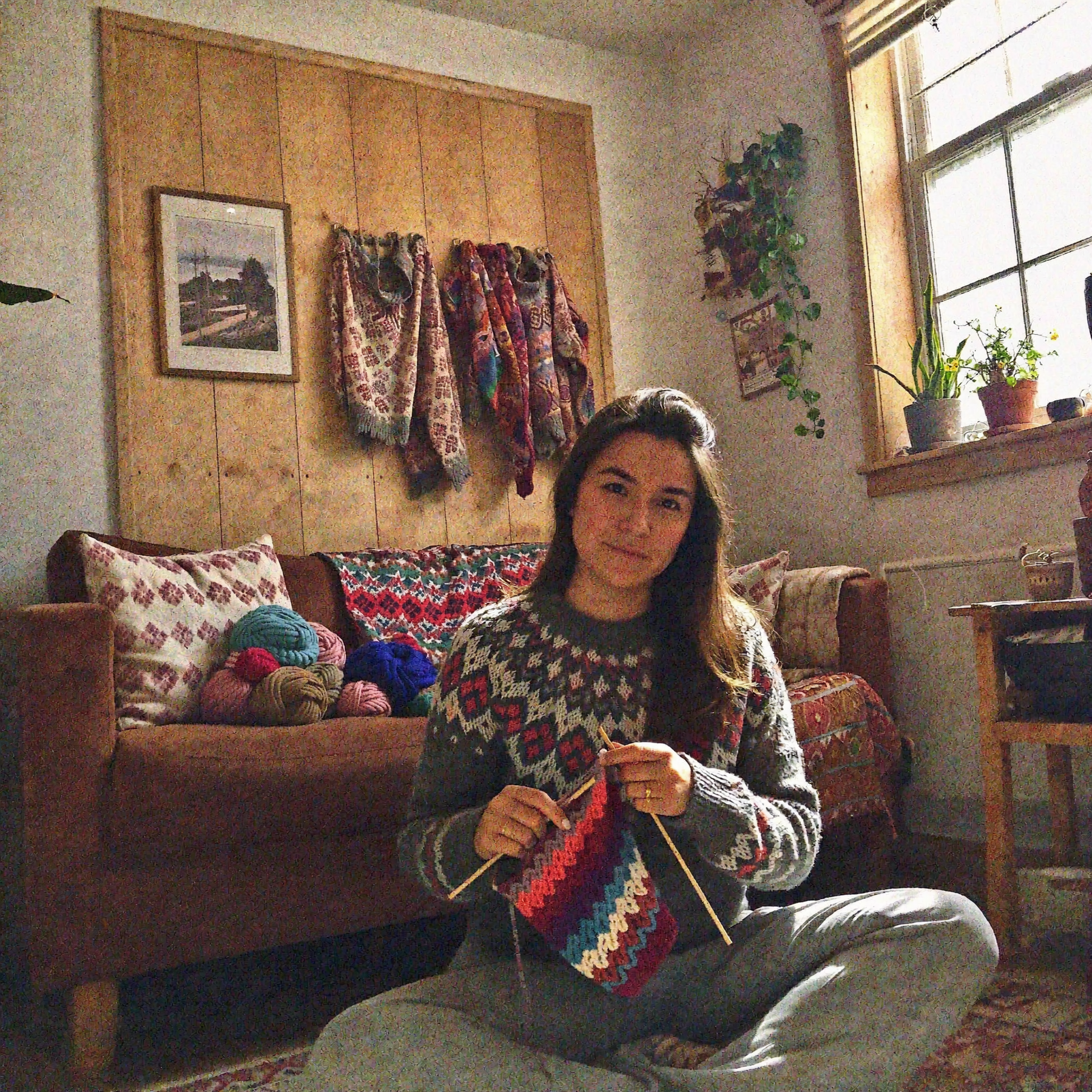 I am Nivi — the younger sister. Aja is my older sister. We grew up in Greenland with a view of the fjord and the cold outside. Our grandmother's knitting needles clicked at the kitchen table every single evening. It was not a hobby. It was part of life. That is how we learned that the world holds together best when hands have something to do.